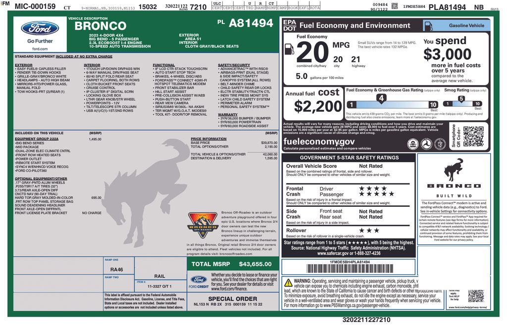 Experience the ultimate in off-road versatility with the Bronco Big Bend's premium features, including a 10-speed automatic transmission, rear parking sensors, and a comprehensive suite of Ford Co-Pilot360 safety technologies. Elevate your driving experience with dual-zone climate control, an auto-dimming rearview mirror, and a convenient remote start system.